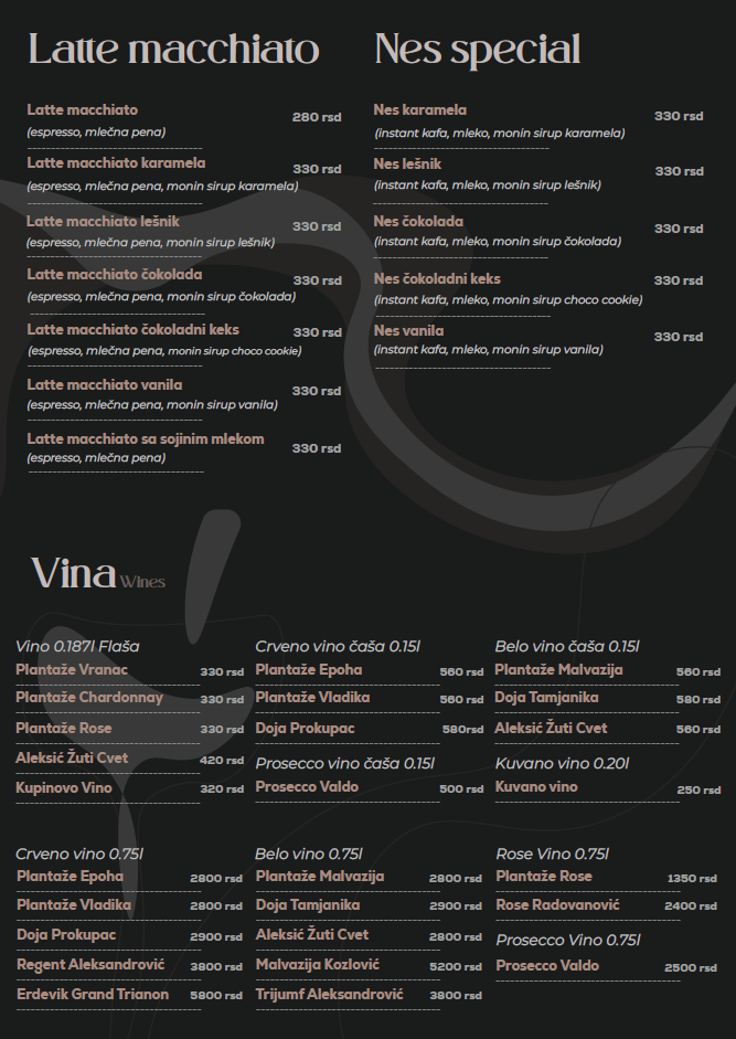 Inspiracija kafom: Unutrašnjost menija krasi minimalizam crnih stranica. Svaka strana nosi diskretne, apstraktne vektorske oblike u dubokim, tamno braon tonovima – direktna asocijacija na teksturu i slojeve sveže pripremljenog espressa.